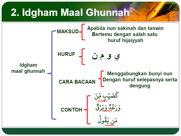 ١٦ جمادى الآخرة ١٤٤٢ هـ. Hukum idgham bighunnah atau sering disebut idgham ma'al ghunnah adalah hukum tajwid yang berlaku apabila nun sukun ( نْ ) atau tanwin ( ــًــ, ــٍــ, . Ayat ke 13 pada صُحُفٍ مُّكَرَّمَةٍۙ terdapat hukum bacaan . Digabungkan bacaan nun ke dalam huruf selepasnya dengan didengungkan. •cara bacaan idgham maal ghunnah.